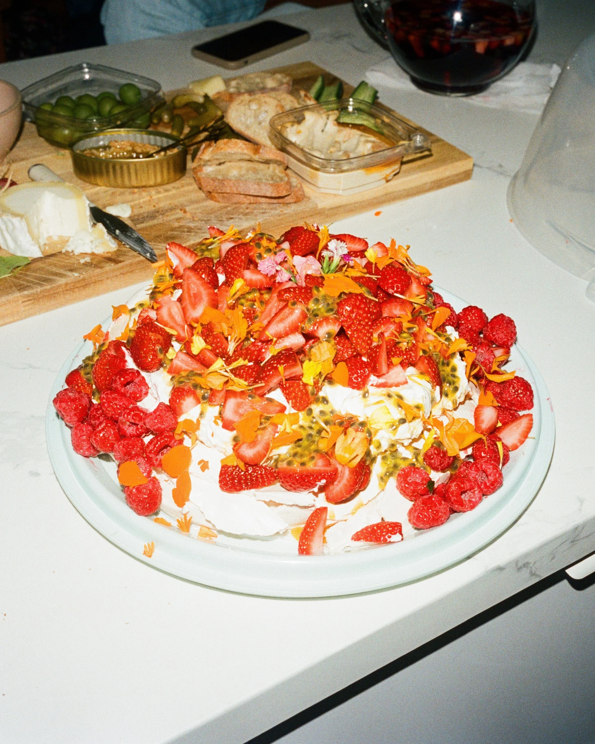 Meringue, vanilla fruit curd, whipped cream, fruits, edible flowers.