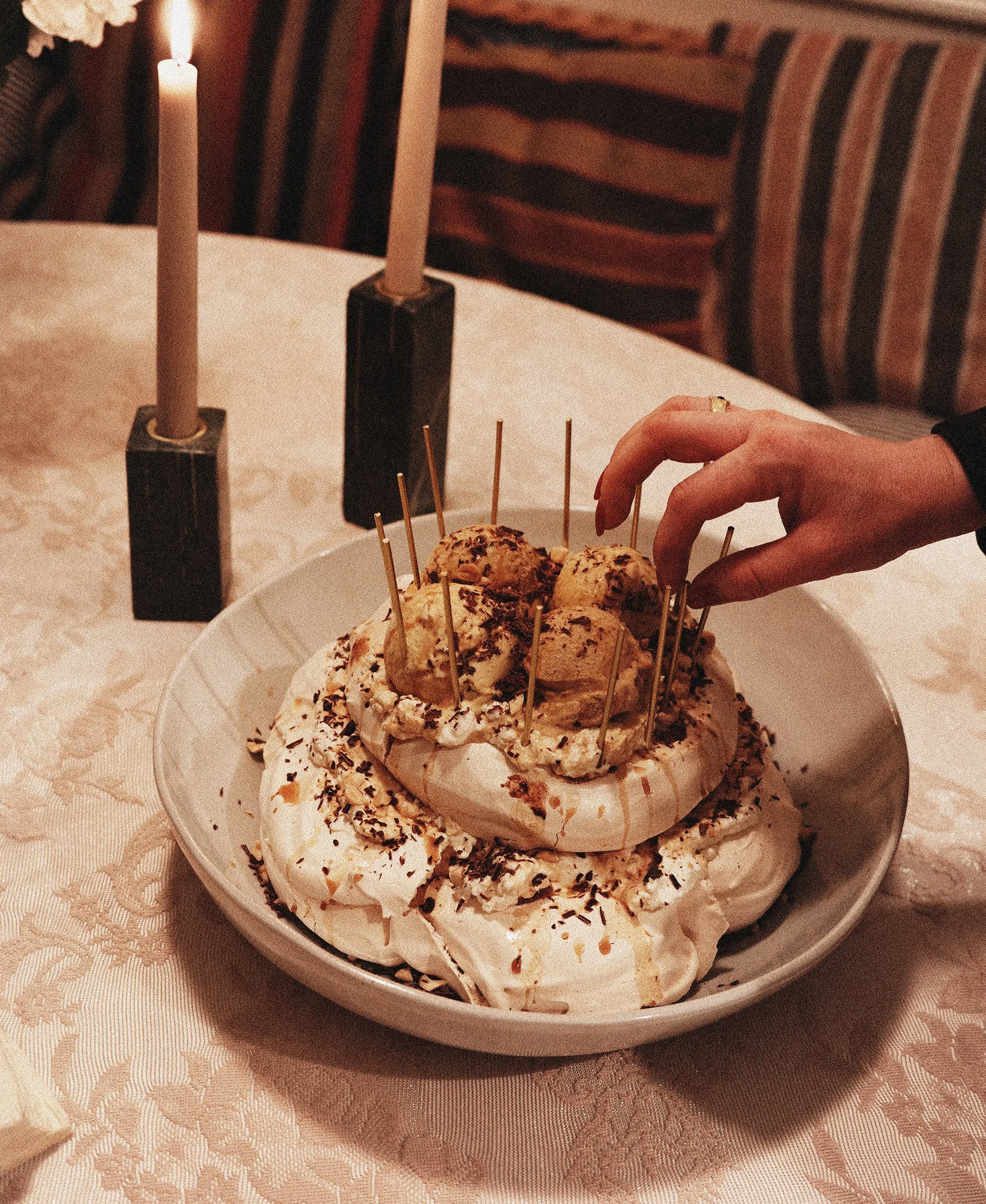 Meringue, coffee chocolate mousse, mascarpone whipped cream, chocolate shavings, nuts (optional)